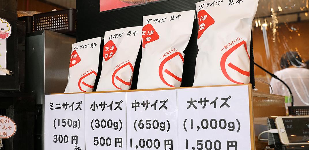 甘栗のサイズは4種類。ミニサイズ130gは300円、小サイズ230gは500円、中サイズ500gは1,000円、大サイズ770gは1,500円(すべて税込)と、大きくなるほどお得になります。