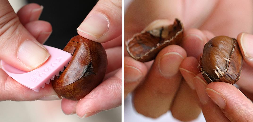 「甘栗は好きだけど、皮むきがちょっとね...」と躊躇しているそこのあなた!ここで皮むきが超絶楽になる「くりわり君」なるものを発見しました!500円玉くらいの大きさのアイテムで、小さな爪のようなものがついています。これで栗に割れ目をいれて、片手でキュッと力を入れると......ぺきぺきっと亀裂が入り、楽に皮がむけるのです!