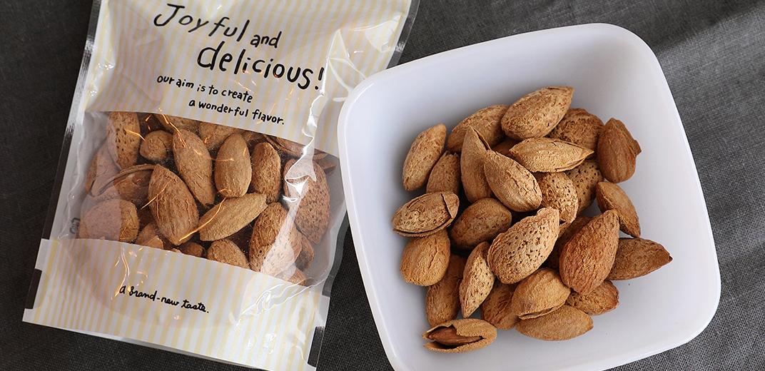 実は甘栗以外にも、さまざまなナッツ類を販売している衣浦食品。落花生やピーナッツ、くるみ、カシューナッツ...と種類豊富なナッツが並ぶ中で、「殻付きアーモンド(300円・税込)」なるものを発見しました。アーモンドといえばこげ茶色のものが頭に浮かびますが、こちらは落花生と同じくベージュ色の殻に包まれています。