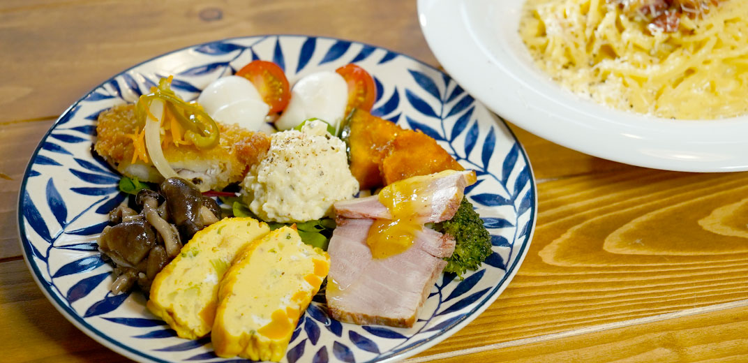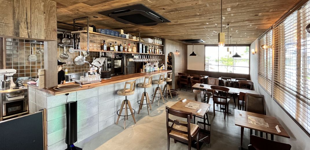 インテリアショップとカフェバーが併設された「ホロスビレッジ」という複合施設の一角にオープンしたおしゃれなカフェバー。オープンから14:00まではドリンクと食事がセットになった2種類のランチプレートと子ども向けのキッズプレート、デザートを、18:00のバータイムからはボリューム満点の肉料理などを提供しています。