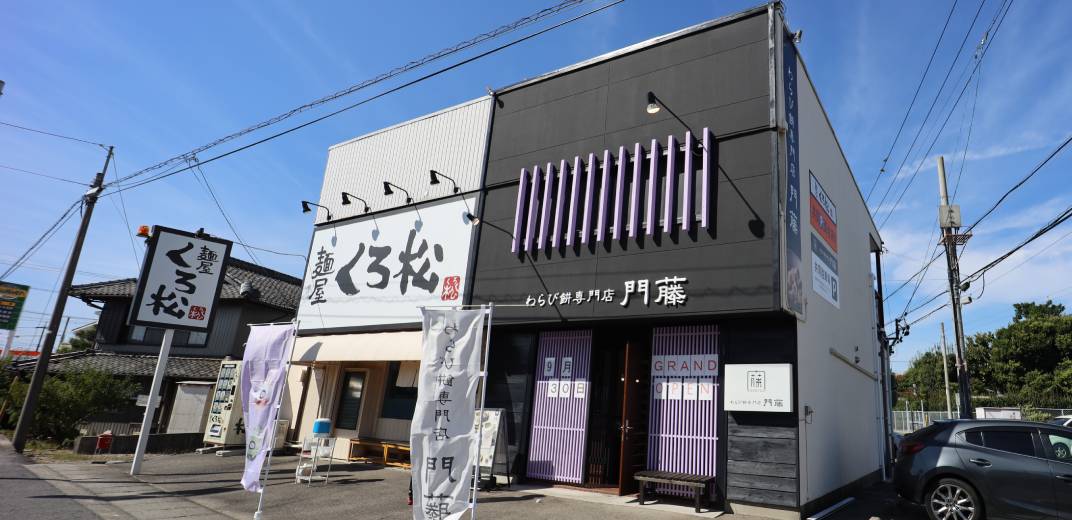 2023年9月30日、愛知県安城市にオープンした「わらび餅専門店 門藤 愛知店」。黒と藤色のスタイリッシュな外観です。駐車場は、隣のラーメン店「麺屋くろ松」と共同で30台分。自動車ユーザーにはうれしいですね!