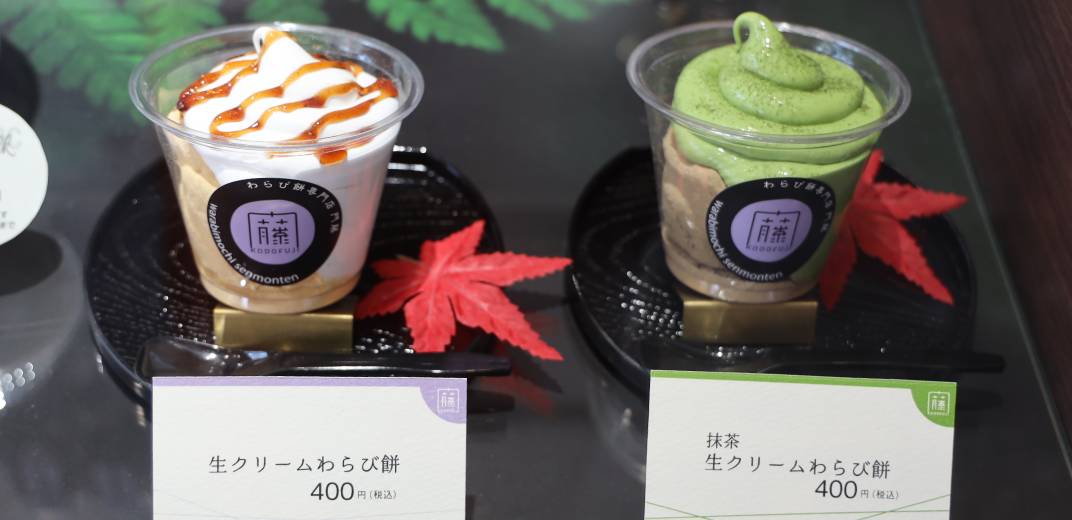 現在、門藤 愛知店でいただけるメニューは大きく分けて3つ。オーソドックスな「本わらび餅 ぜいみ」、ミシュランシェフとタイアップしたオリジナル商品「わらび餅ドリンクWARABI-TA(ワラビータ)」、和洋折衷スイーツの「生クリームわらび餅」です。
