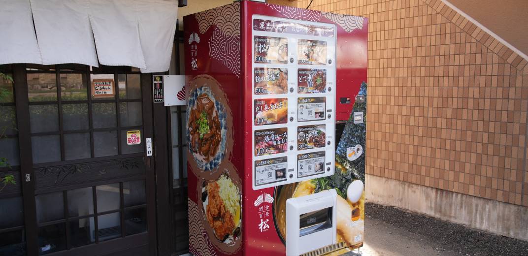 愛知県安城市の浜富町交差点から西へおよそ300mにある「酒食百景 松」さん。入口にはお店で提供しているメニューの自動販売機が鎮座!