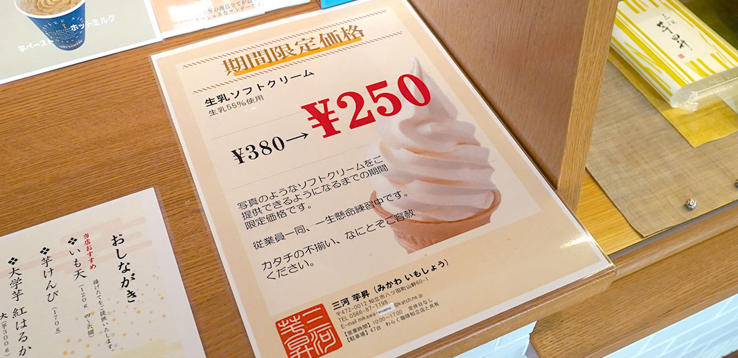 カウンターに置かれたメニューを見てみると面白いキャンペーンを発見!内容は「通常380円のソフトクリームが今だけ250円に割引」というものなのですが、よく読むと、「写真のようなソフトクリームをご提供できるようになるまでの期間限定価格です。カタチの不揃い、なにとぞご容赦ください。」という文字が…!