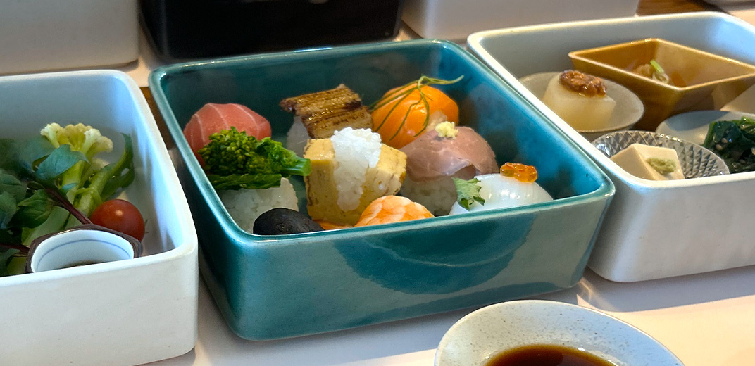 ランチメニューのイチオシ「手毬寿司お重(2,580円)」は、数量限定メニュー。魚の鮮度はもちろん、地元で採れた新鮮な野菜にもこだわったランチセットです。