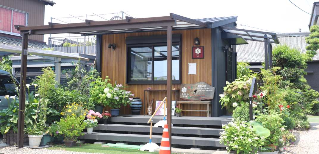 「me-time」があるのは、名鉄西尾線「桜町前」駅から徒歩2分の大通り沿い。木目の外観と大きなガラス窓、そして観葉植物が目印です。