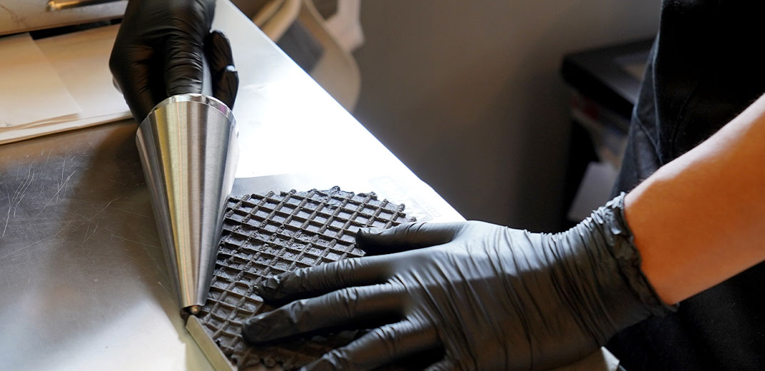 チョロクリムでは専用のワッフルメーカーで焼いた生地を型で巻き取ることで、よく目にするコーンの形に成形しているんだそう。成形した生地が冷めるとサクサクの香り豊かな特製ワッフルコーンが完成します!