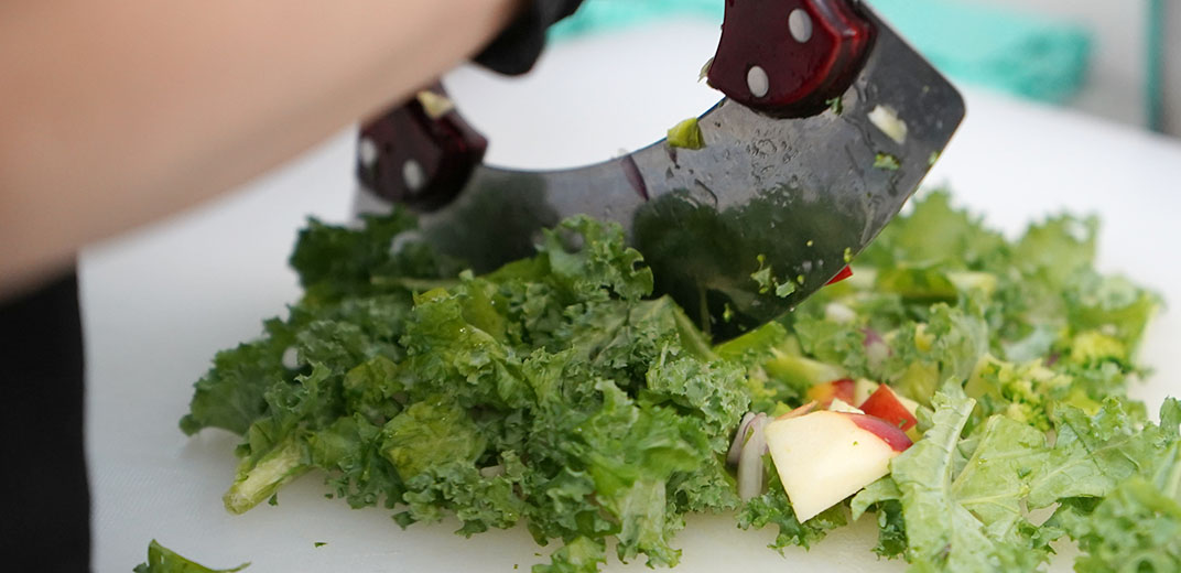 チョップドサラダとは、具材をすべて「チョップ=叩くように切る」サラダのことで、野菜はメッザルーナという三日月形の両手包丁を使ってザクザクとカットしています。