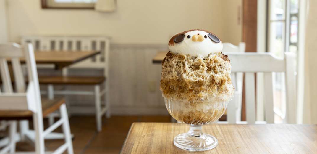 見た瞬間にハートを撃ち抜かれるこちらのかき氷は、「ティラミス犬 かき氷(1,408円)」。刈谷市の「パティスリーフレーズ」の看板商品「ティラミス犬」のケーキがかき氷になりました。