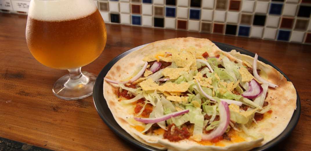 「FOOD&DRINK NOMASSE」さんのオススメ料理、最初は『タコスピザ(800円)』。トウモロコシと小麦粉から作られたトルティーヤ生地に、10種類のスパイスを効かせたオリジナルのタコスミートとチーズを乗せてグリルへ。程よく火が通ったらレタス、レッドオニオン、サルサソースなどをトッピングして完成です。