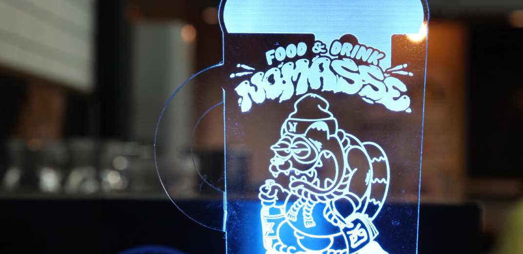 西尾市役所から南へ100m。ビルの1階にある「FOOD&DRINK NOMASSE」さんにお邪魔しました。看板のキャラクターは商売繁盛のご利益があるとされるタヌキをデザインしてもらったのだとか。