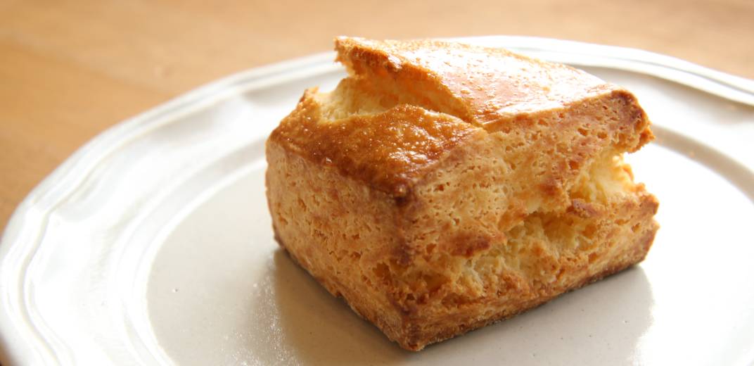 口に運ぶと、しっとりとした食感が心地よく、スコーン特有のパサつきはまったくありません。表面はザクザクとしていて、噛むほどに楽しめる食感のコントラストも魅力です。