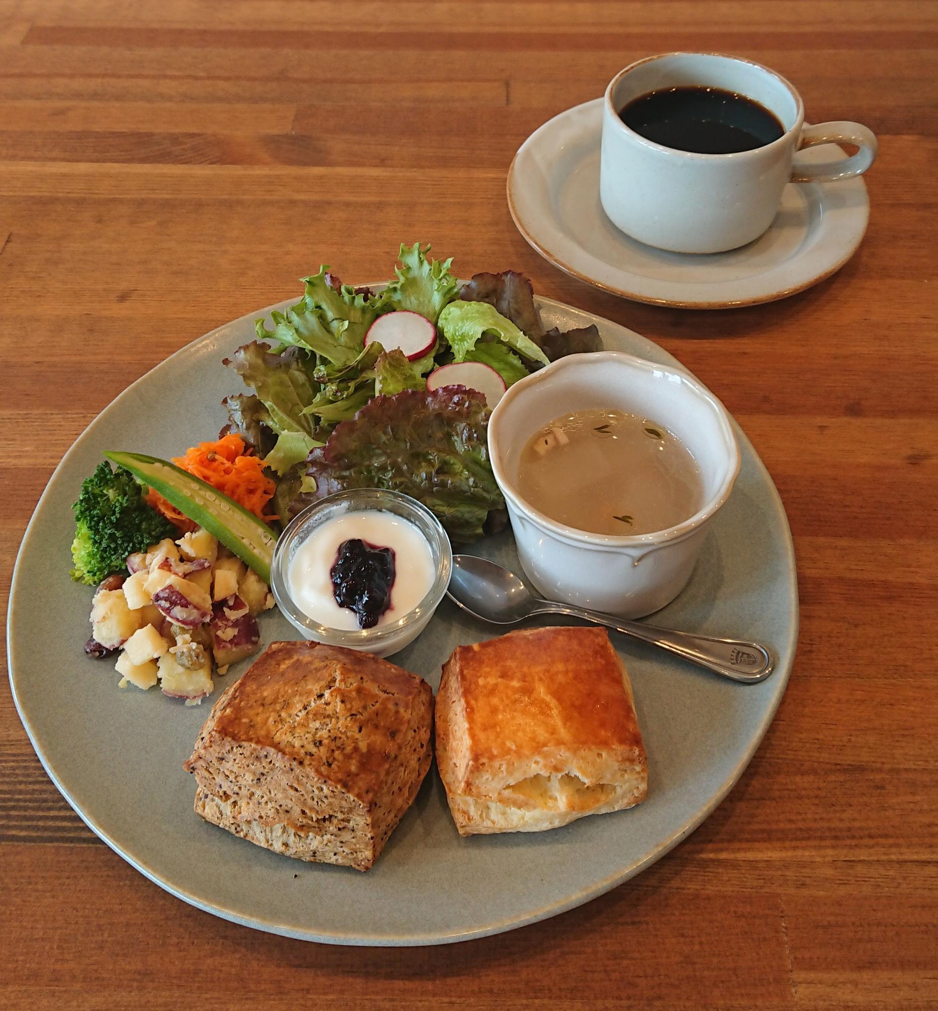 ランチタイム(10:30〜14:00)には、「スコーンプレート(1350円)」として、サラダやスープ、デリ、ヨーグルトと合わせて、プレーンスコーンとお好みのスコーン1種類を選べるプレート(1350円)がおすすめ。「食事のおともにスコーンを食べるの?」と感じるかもしれませんが、実は相性も抜群!素材の味が際立つように焼き上げられているので、満足感もたっぷりです。