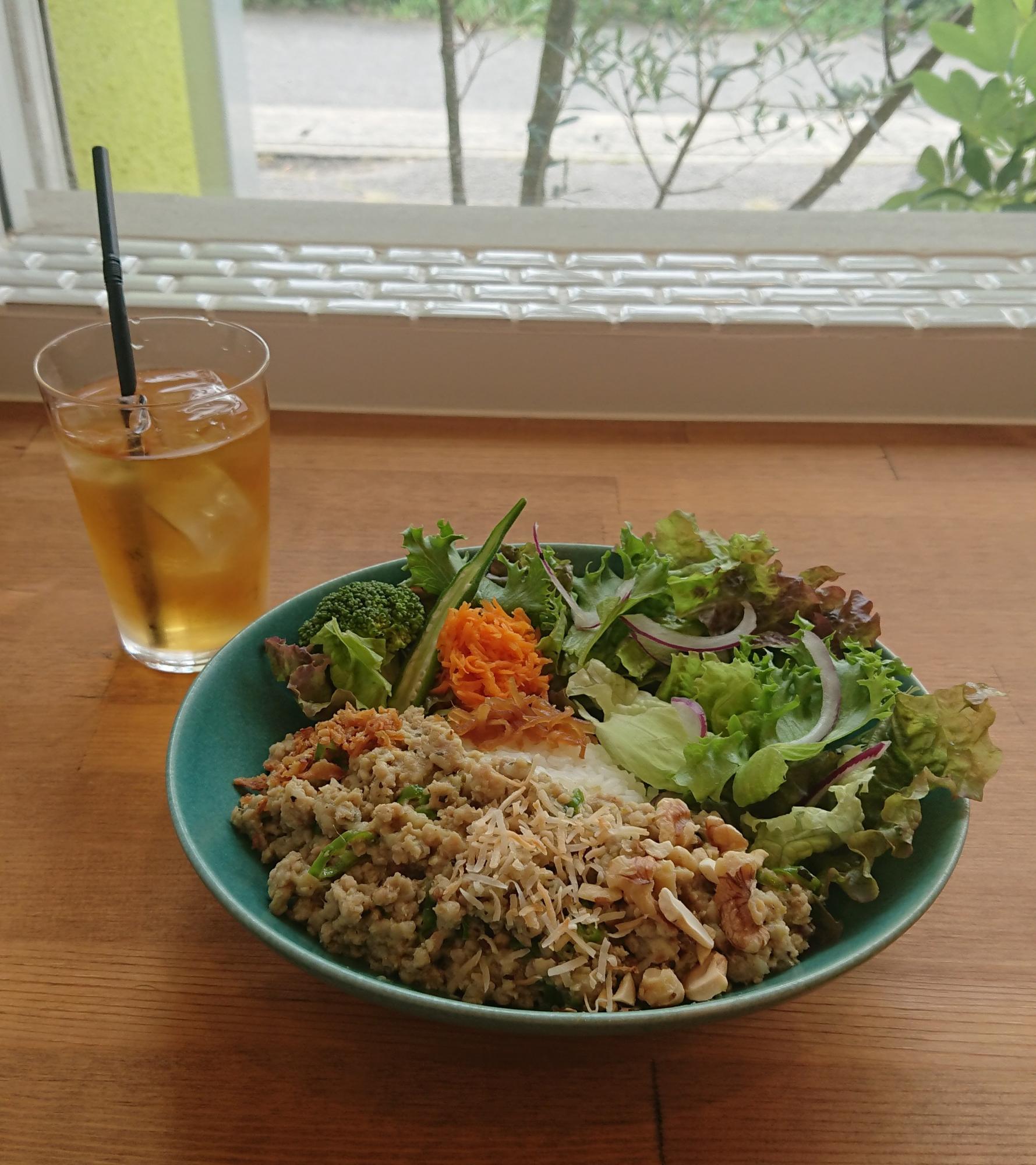 「me-time」では、スコーンだけでなく、国産肉を使ったハンバーグやグリーンキーマカレーといったフードメニューも充実。特にグリーンキーマカレーは、ココナッツミルクのまろやかな甘さが特徴で、後味にほんのりと辛さが感じられる絶妙な味わい。辛いものが苦手な方でも楽しめる優しい風味です。