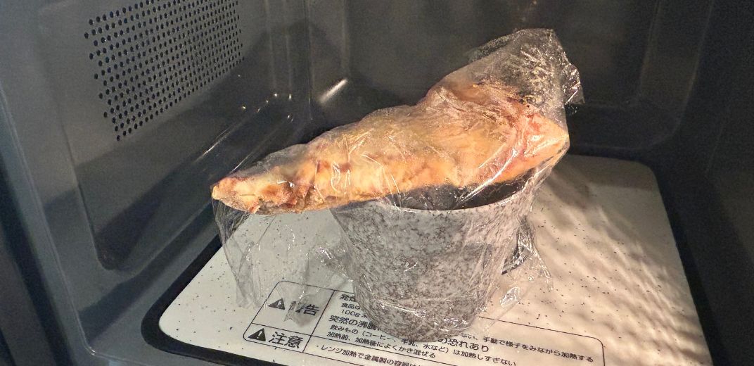 解凍時は写真のように、水を入れたコップの上にピザをのせ、ふんわりとラップをかぶせて500Wで2分ほど温めて。冷凍したピザのみをレンジで解凍すると、生地が固くなってしまったり、温め具合にムラができたり、パサついてしまったりしてしまいますが、こうすることで焼きたてのようなふんわりとした食感が戻ってきます。