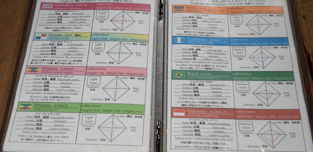 特色あるコーヒーを楽しんでほしいという思いが込められている店名「BUNT COFFEE」。美味しいコーヒーの世界が楽しめる、その入口のような店を目指しているそうです。お店のコーヒーメニュー表は、豆の特徴が詳しく書かれています。さらに酸味、苦味、甘み、コクがそれぞれチャートになっていて、自分好みのコーヒーが選べます。皆さんも「BUNT COFFEE」さんで、コーヒーの世界を楽しんでみてはいかがでしょうか。(取材:加藤万由子/2024年10月取材・撮影)